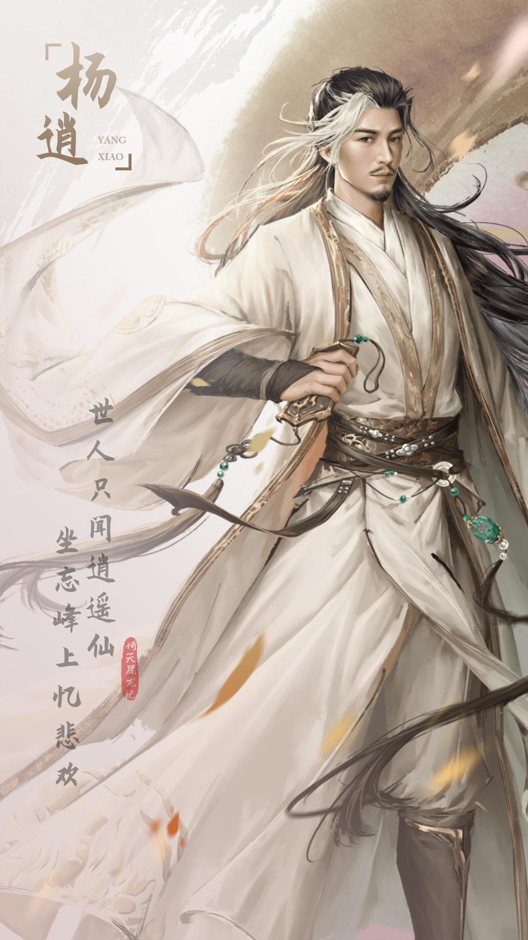 生平:明教教主座下光明左使,与光明右使范遥并称“逍遥二仙”,其人外冷内热,亦正亦邪,冷峻孤傲,文武全才,平时多是一身白色长袍的书生打扮。少年时与峨嵋派男弟子孤鸿子比武,夺其“倚天剑“,掷地而去,当时名闻天下的大高手孤鸿子由此被气死,杨逍也因此与灭绝结下了梁子。期间杨逍爱上了峨嵋女弟子纪晓芙,并与她有了两人的女儿杨不悔,平日隐居昆仑山坐忘峰,在纪晓芙身亡后一人抚养女儿长大。张无忌任教主后,他悉心协助,出谋划策。三联版中张无忌退隐前,留书传教主之位于他。