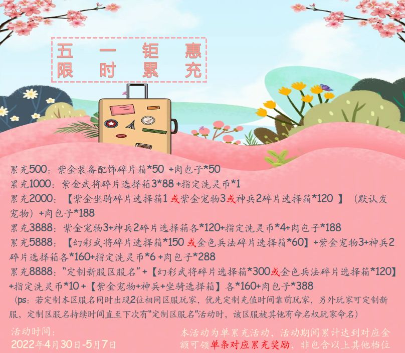 【活动说明】在活动时间内(4月30日-5月7日)累计充值达到金额可领取对应档位的大礼包哦,活动为单项累充,只可领取活动期间内累计充值总和对应的最大档位(例:蔡文姬妹妹活动期间累计充值2000元只可以领取单独2000档位奖励哦。不包含以下的1000+500)