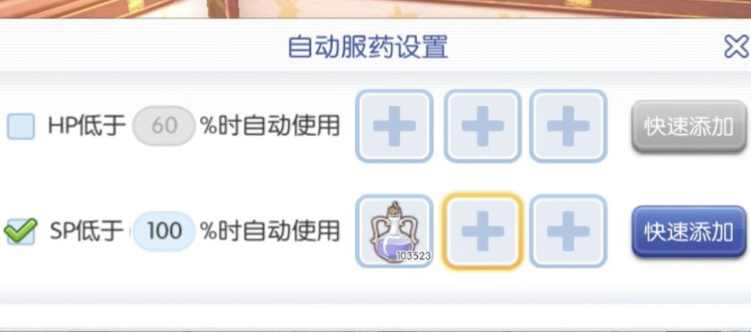 至于耗蓝问题,前段时间游戏增加了战斗吃蓝功能,设置SP低于100%后自动吃蓝药水(挂新图就掉),全程可以做到满蓝;