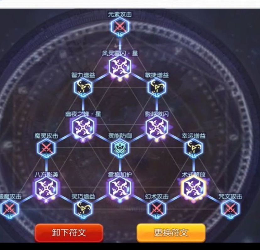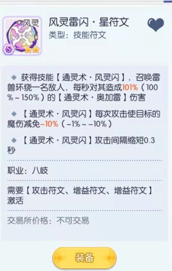 这个符文的重点在于第二条越高越好,满属性10%就是减对方100%魔防可以减到负数,debuff一共有10层,只要一直释放风灵闪就会堆满,第三个词条是增加了频率,保证了一个风灵闪就能堆到十层,没词条就必须第二个接,最好是二三都有,不然的话就追求第二个高属性也可。