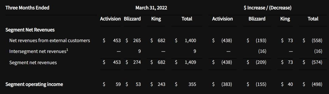 然而,如果分别去看动视、暴雪、King 三个部门的具体表现,会发现一个现象:上述跌幅都是动视和暴雪导致的,而 King 的各项数据都是上涨的,其营收高达 6.82 亿美金,超过暴雪的 2.65 亿和动视的 4.53 亿,是收入贡献最大的一个部门。