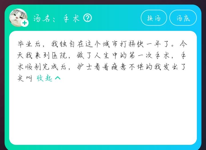 毕业后,我独自在这个城市打拼快一年了,今天我来到医院,做了人生中的第一次手术,手术顺利完成后,护士看着疲惫不堪的我发出了尖叫。
