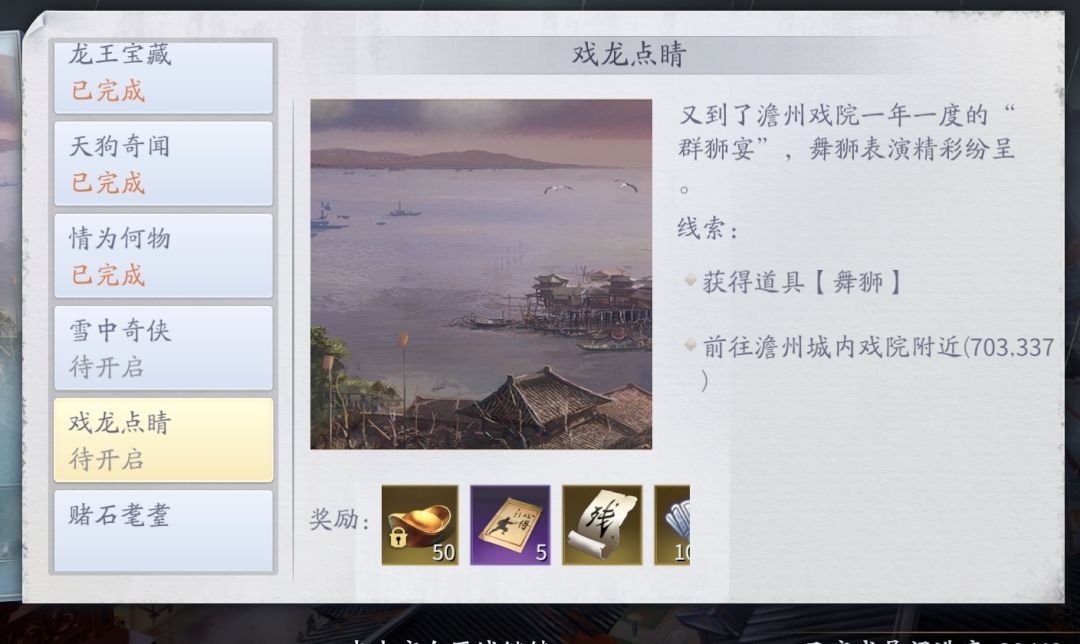 ❶儋州异闻戏龙点睛 先按坐标找到位置看客NPC对话激活 再要收集里面舞狮道具 到指定坐标接任务完成