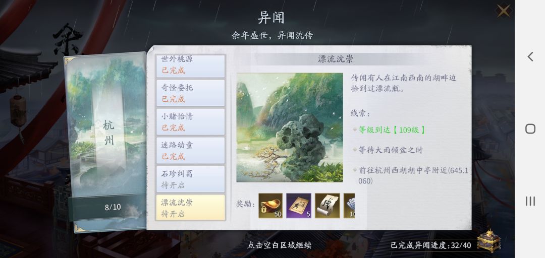 ❼杭州异闻漂流沈崇 先按位置找到位置激活 再要等级和天气位置接后续任务