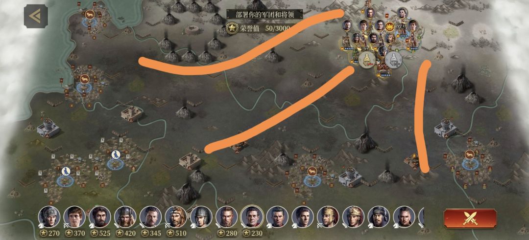 本关兵分三路,上中下,腿最长的往下路,因为虽然汉军数量不少,但是下面一旦暴兵,也挡不住,所以必须要三路出击。本关成功主条件击败3支关键队伍,副条件占领4个城区和18回合内。注意占领城区之后比蒙,秦俑(庞培候选)放中间,和建筑保持Y型,防止士气大幅下降,建筑坏了及时拆除补建,建筑里防御区域最便宜比较合适,史诗战争里不能补兵所以钱对你没用,建筑主要以工厂和防御区域为主,工厂用来提供建筑工事所需的铁,防御区域用来消耗。嗯,这关要注意的就是这些,剩下的就打就行,不过友情提示,确实打的很恶心,射到你吐,实在受不了就备点血包吧,不过剩下两关也差球不多,都是怪兽海,真是不辜负复活的军团这名字。