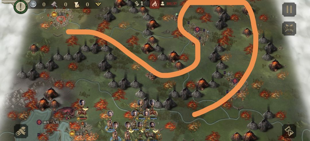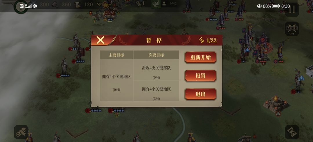 先来看看这关要求,主要目标拥有4个关键地区(红圈),次要目标击败4个关键队伍和拥有4个关键地区(篮圈),先说目标就是我们费了这么大力气为的就是拿三星,所以这关要先杀关键怪,再占城。这关的关键怪是大祭坛和龙车,特点就是血铁别厚,所以持久战不可避免,搞闪击死的很惨。