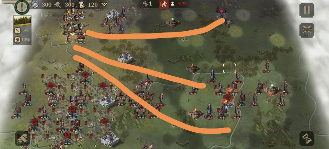我的思路是先占红圈城再杀怪。这里说一点小惊喜,你占领城后会有小股汉军增援,其中包括战象,还是不错的,但不能全占,有一把我就是光顾着占城差一个boss,只得2星。在打到一定回合的时候,汉军卫将军会来支援一波,后期霍将军也会支援一波,所以怪兽海肯定还是很海,不过还是有点支援的。这关的战术就是占城,得到支援抗住一点一点推,毕竟22个回合还是很长的,建筑选择什么,占领城区后怎么守,第一关攻略已说,不在赘述。