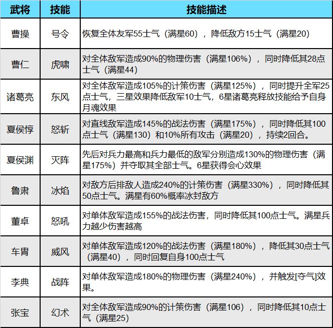 战马技能虎啸:释放技能降低敌方士气时,额外降低5点士气。