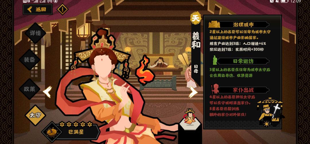 以羲和举例,这类名臣会加当前城池粮食、金钱、人口、征兵的百分比产量,此外 羲和 和 萧何 还能额外加发展时间,不过上次更新后好像修复了两个城重复刷属性的bug,也就是一座城只能生效一次。