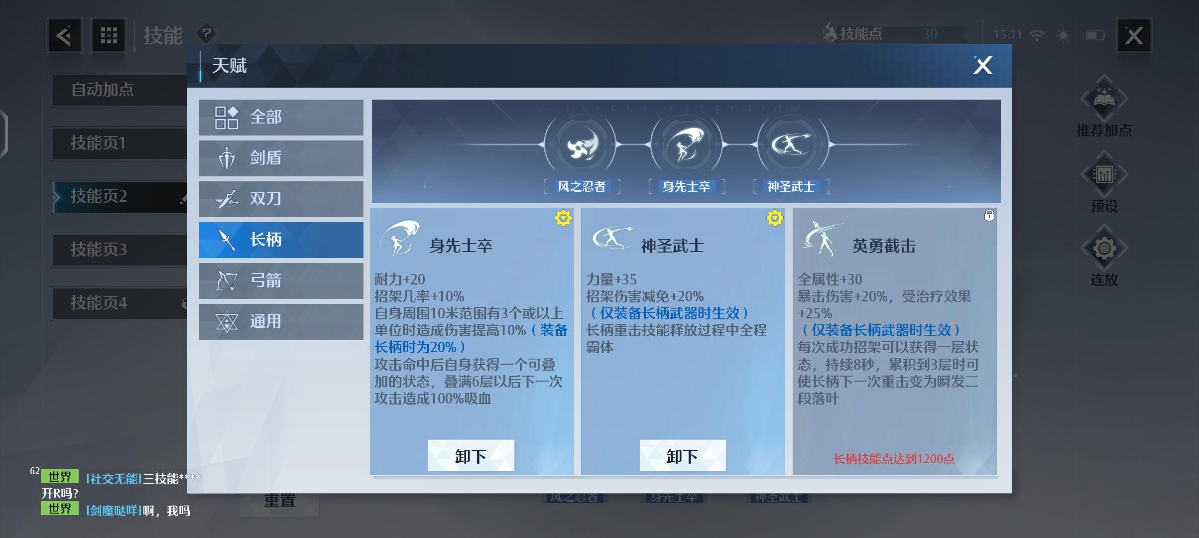 4、接下来说一下长柄武器天赋选择了。长柄天赋有【身先士卒】(技能消耗200点解锁)、【神圣武士】(技能消耗500点解锁)、【英勇截击】(技能消耗1200解锁)。