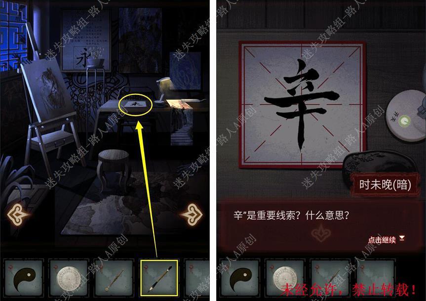 21.查看纸条的背面,再次用【毛笔】在田字格写字,得到线索【辛】。21.1、21.2