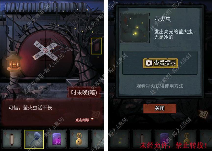 9. 点击树上的相思牌,用【渔网】捕捉【萤火虫】。9.1