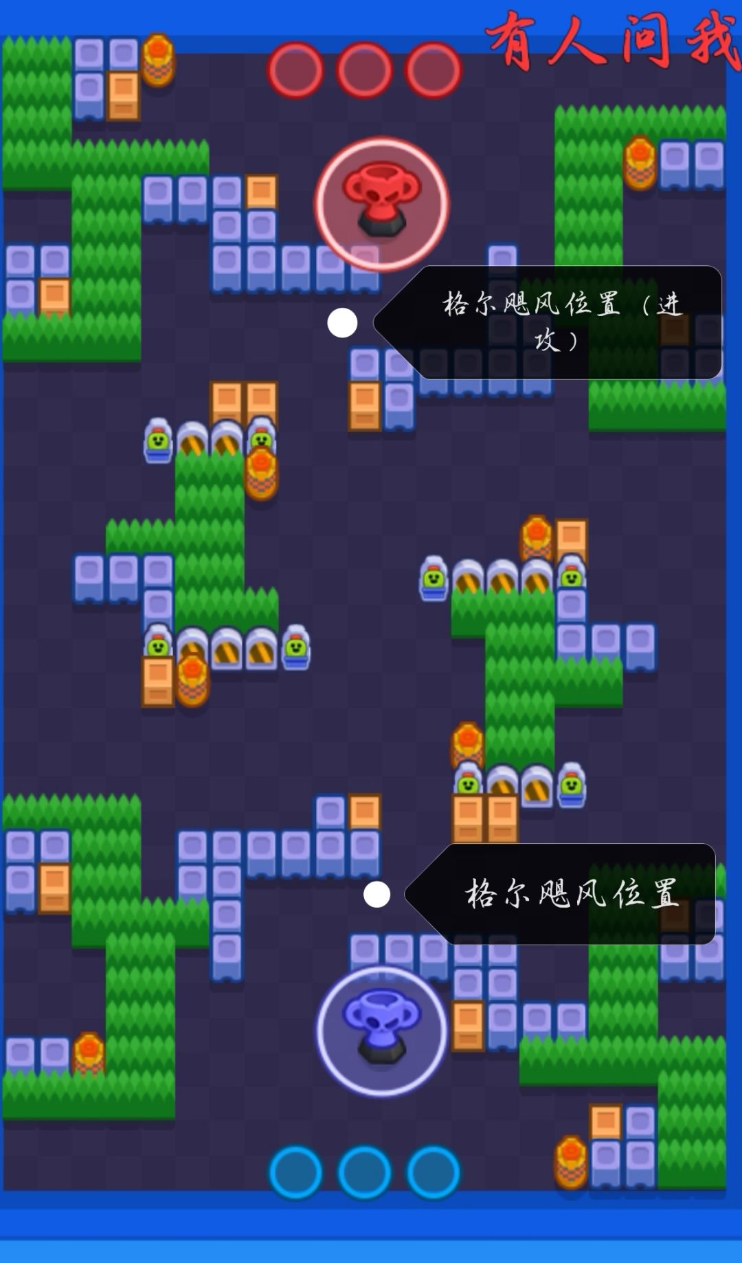 夺奖杯模式野排直接拿格尔!防守能力强,减速加飓风能让敌方很难带出奖杯。地图上标出了飓风我认为比较好的位置。