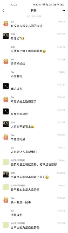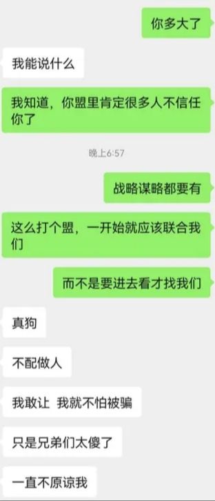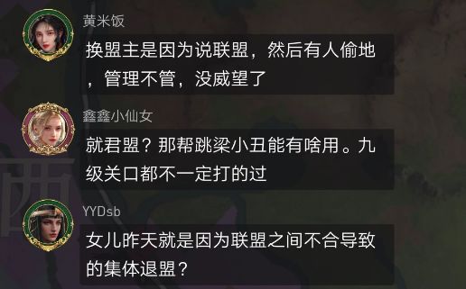 但是在语气方面女儿国前盟主在战全胜看来有些趾高气昂。并且有句话在战全胜盟里被传开那就是女儿国前盟主对战全胜管理说的:给你们大腿你要抱,不要不识抬举。