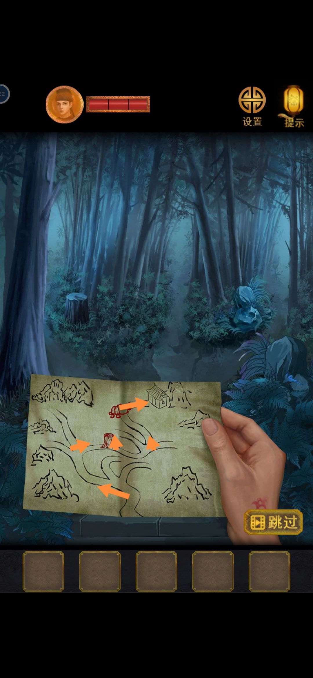 到庙里右边,把布挂在左边房梁上。右边提灯人偶的灯里捡个金字滑块,然后把萤火虫放进去,点灯关灯笼门。布上倒映出影子,五行对应了五个符号。