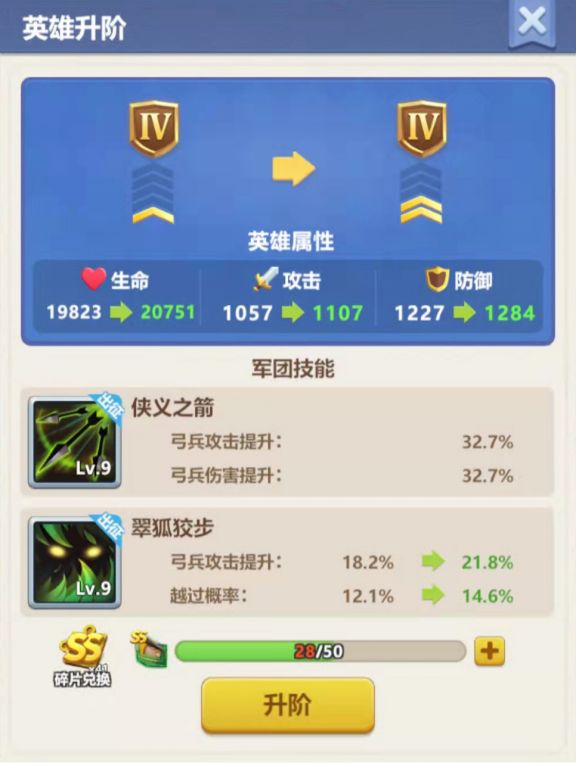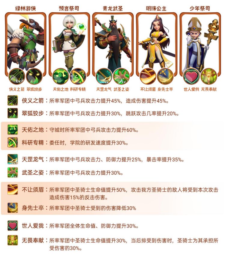 侠义之箭和翠狐狡步均属于兵种增强型军团技能,可大幅提升弓兵75%攻击力、45%伤害,并且提高20%越过前排概率,极限拉高弓兵输出能力。