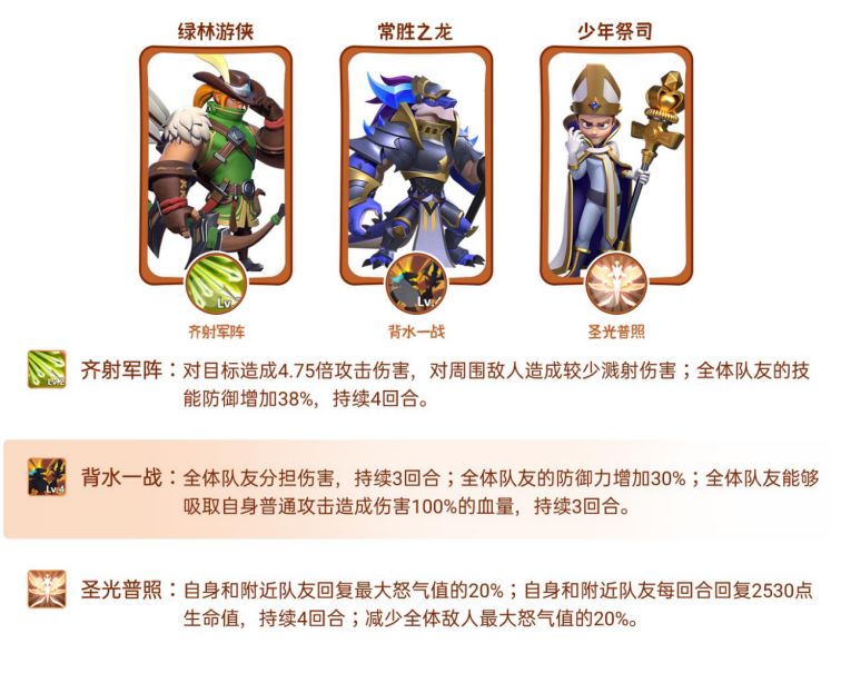 可与预言祭司、青龙武圣搭配,形成以弓兵为核心兵种的守城阵容,在配备圣骑士作为前排的情况下,另外两名英雄可选择明珠公主与少年祭司。