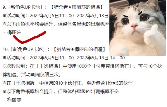 大家好,最近官方大大放出了5月5日更新梅丽莎的消息,我初始还以为国服会参考(国际服:梅丽莎&机娘 //日服是:梅丽莎&袖箭 )的情况二选一更新梅丽莎,没想到国服居然把梅丽莎放出了单人UP池!!!