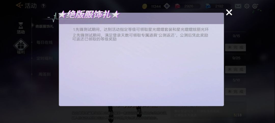 10级-光环-------15级-星光熠熠套装---------25级-光环----------登录18天-公测返还道具
