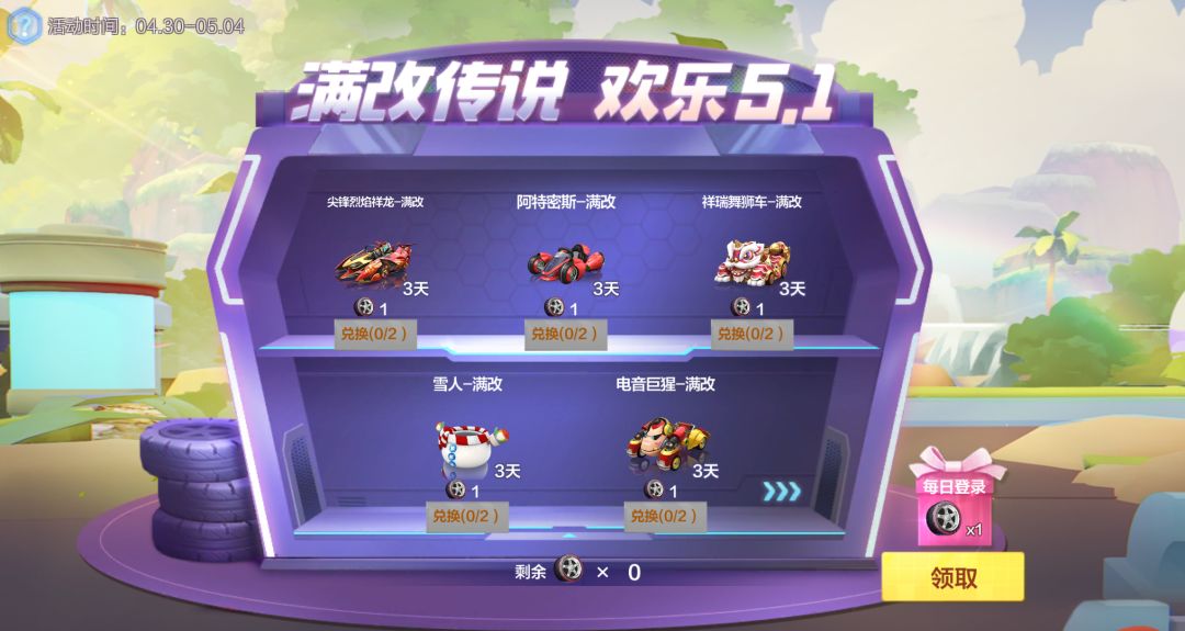 活动期间,每日登陆游戏即送赛车轮胎碎片,消耗指定数量的赛车轮胎碎片即可兑换期限满改传说赛车~