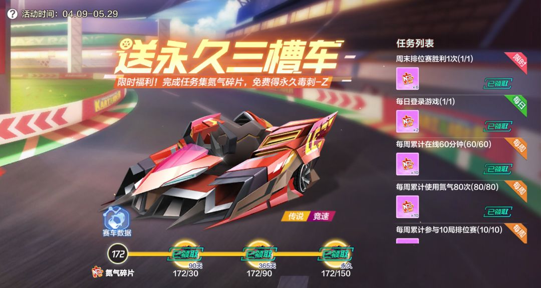 活动期间,通过完成任务领取的氮气碎片即可兑换由神秘工头精心设计改良的永久三槽赛车毒刺-Z。