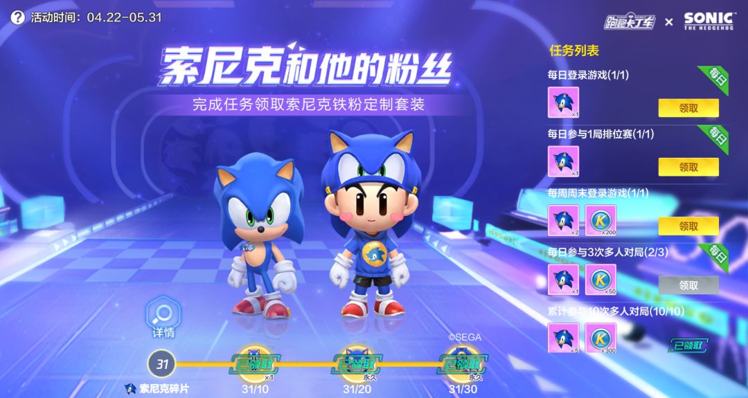 活动期间,通过完成任务领取的索尼克碎片即可兑换专为索尼克铁粉设计的永久期限索尼克服饰套装。