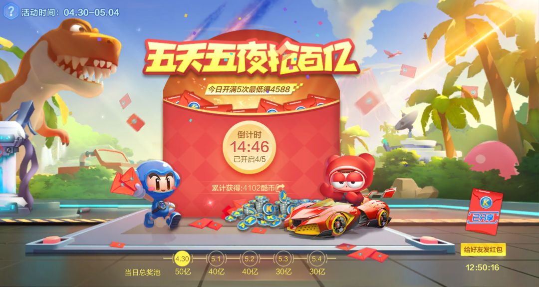 活动期间,每日共有5次开启红包的机会,红包开启后将随机获得不同额度的酷币,每天开启红包时有概率额外获得拼手气红包,参与活动可获得海量酷币,车友们不要错过~