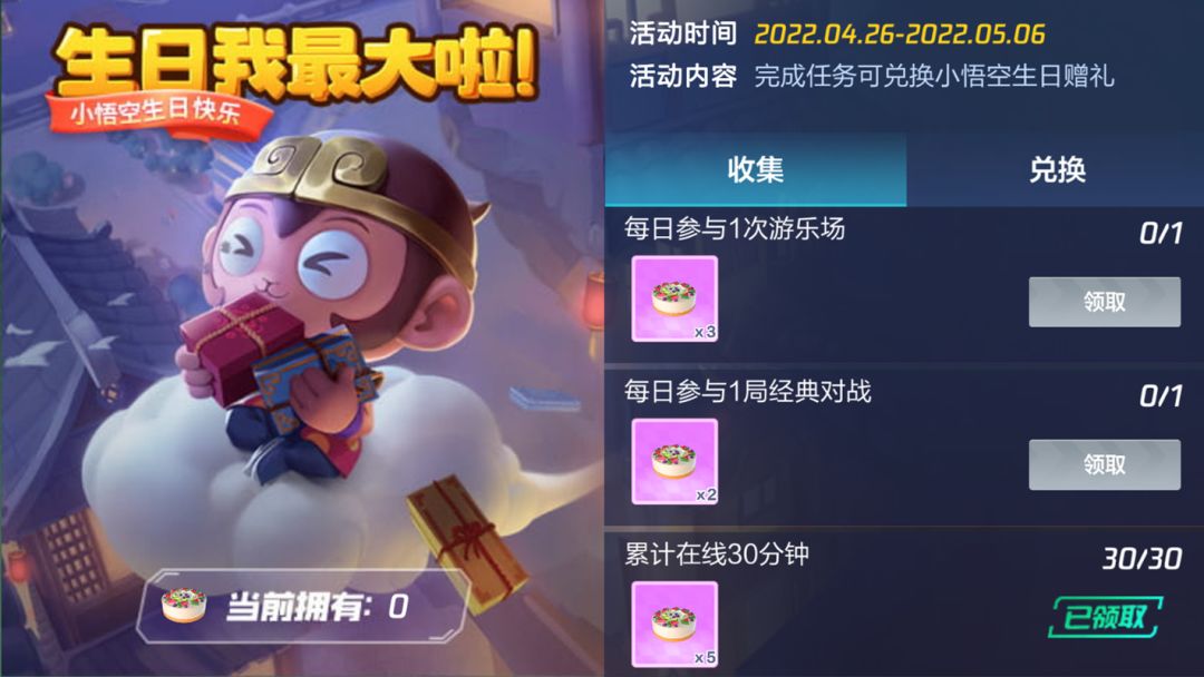 活动期间,通过完成任务获得小悟空生日碎片,可以兑换悟空生日喷漆、小悟空生日盲盒等好礼~