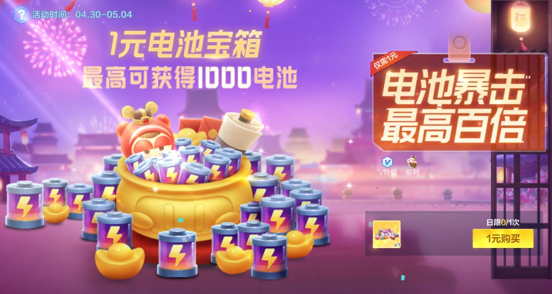 活动期间,福利站每日可直购1次1元电池宝箱,开启宝箱可随机获得电池,最高可获得1000电池~