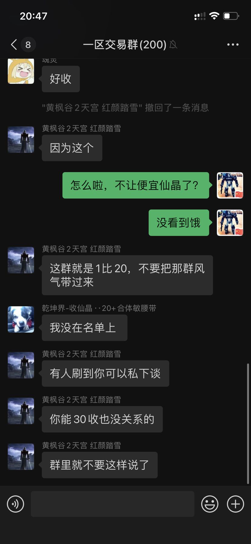 开了一个一区交易群,明面说的自由交易,暗地里高价卖仙晶。最近发工资了,我们都1:25收仙晶了,他还要1:20收还要别人包费,1:25以上收仙晶的就威胁人家,一副丑恶嘴脸。有图为证,现在他的发言那里已经禁止发言了,真是笑话。