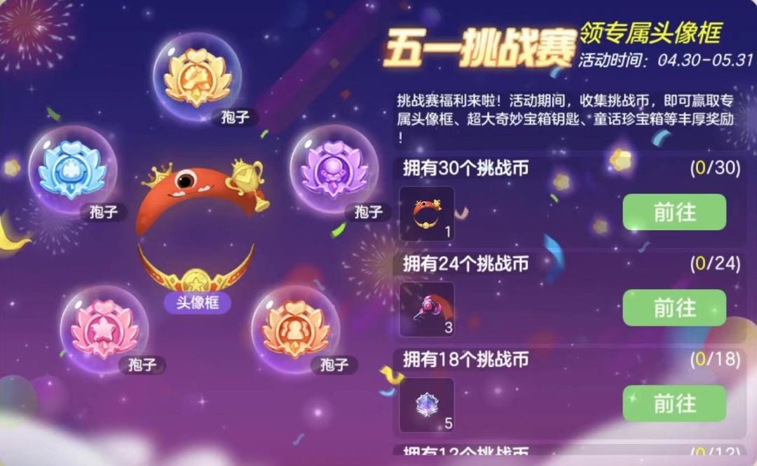完成任务收集挑战币,赢取专属头像框、专属孢子、超大奇妙宝箱钥匙等丰厚奖品。