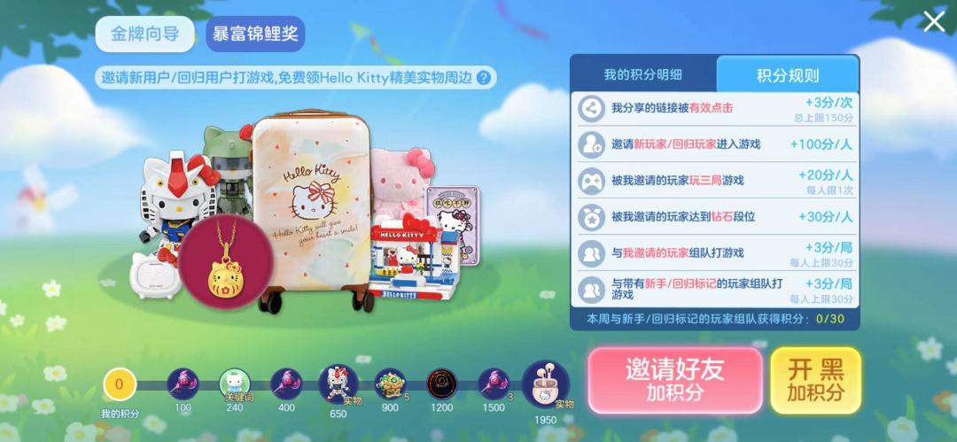 完成金牌向导任务赚取积分,百万Hello Kitty正版周边免费领!积分达到要求即可报名参与暴富锦鲤奖抽奖,超珍贵的豪华Hello Kitty实物周边带回家!