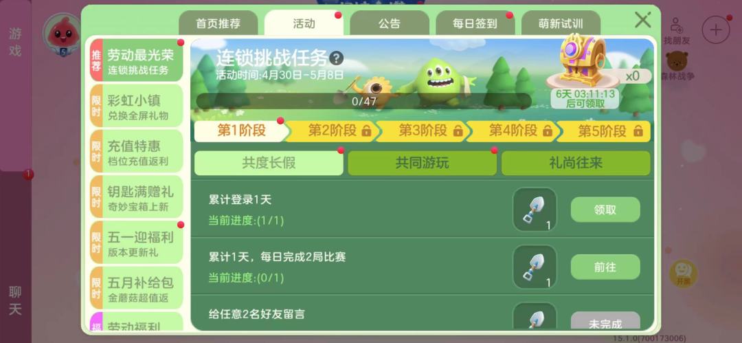五一劳动节快乐,完成连锁挑战任务,长假宝箱等你拿!