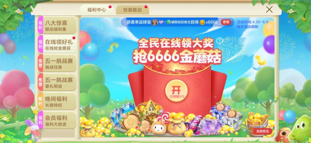 五一福利来啦,全民在线抢海量金蘑菇!登录游戏即可抽超级大奖,最高可领取6666金蘑菇,还有专属孢子、超大奇妙宝箱钥匙等丰厚奖励。活动期间每天有5次领取机会哦,一起上线抢奖励吧!