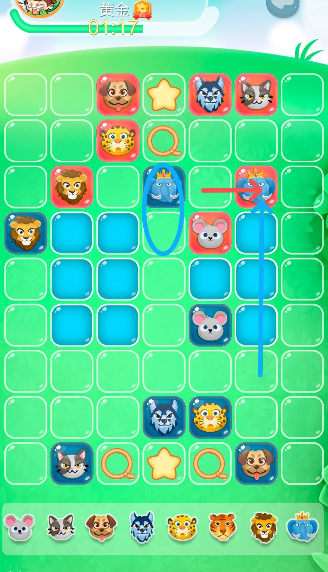 对方想在蓝线处和我兑老虎简化局面,但这样一兑却把我的大象放了进去,这个局面红方想要不速败只能弃掉狮子,蓝方必胜