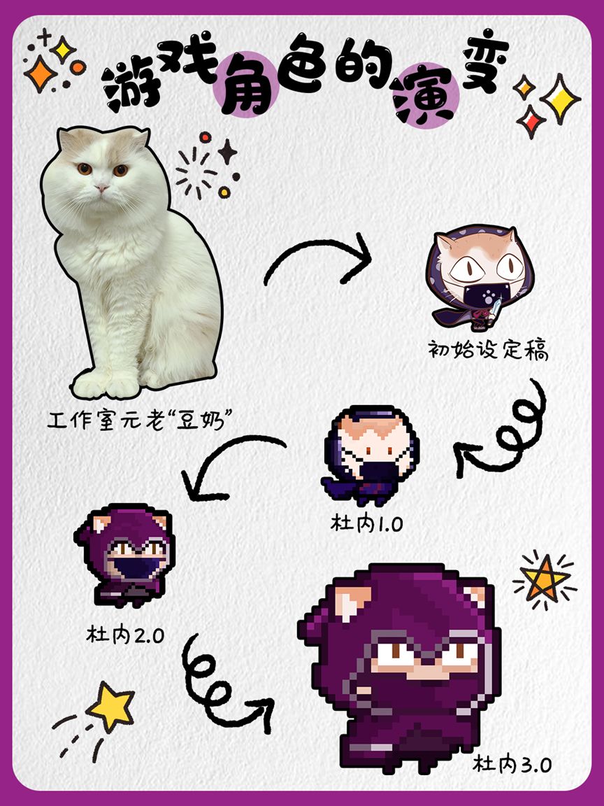 考虑到刺客的特性是敏捷,而猫又刚好与之相匹配,便开始想着用猫这个形象。然后,趴在工位上的豆奶就顺理成章成为了我们的形象原型(可看上图初始设定稿),而名字也是取了豆奶的谐音“杜内”。虽然游戏内的杜内很敏捷,但是现实的豆奶是个慢吞吞的懒猫。