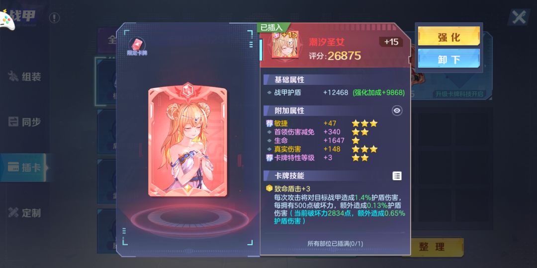 先来看看核心限定红卡潮汐圣女:卡牌技能致命盾击,每次攻击对目标铠甲造成百分比护盾伤害,破坏力每增加500点,会额外造成百分比护盾伤害。
