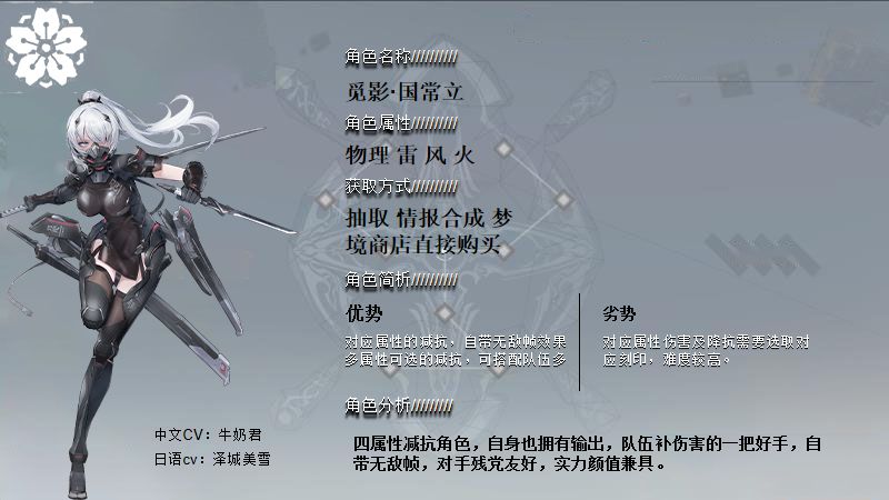 各位管理员,大家晚上好,今天月光为大家带来的是觅影·国常立的个人攻略。国常立不仅是目前游戏里唯一一个多属性伤害的角色,还是目前唯一一个可以在商店购买整个的S角色。那么就让我们来看看,这位御姐型角色该怎么去操作吧。月光为各位列出了目录,方便观看。