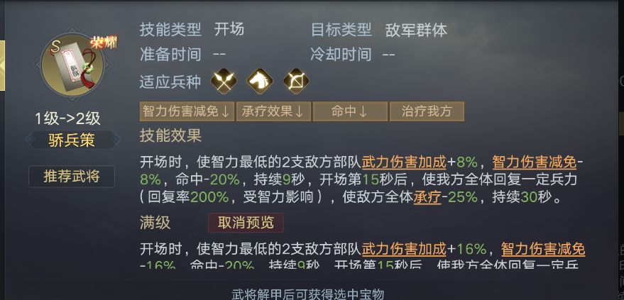 效果①是减少敌方智力最低的法抗和命中,增加武力伤害,这个效果虽然是增加了敌方的武力伤害,但是敌方的法抗和命中降低了,这样能让我方队伍的法师型武将在第一波(6-7.5秒)打出可观的伤害;效果②回复我方全体队伍的兵力,减少50%敌方全体承疗效果,这也就让敌方的回复能力降低了一半,也就减少了打持久(1分钟)的可能性。