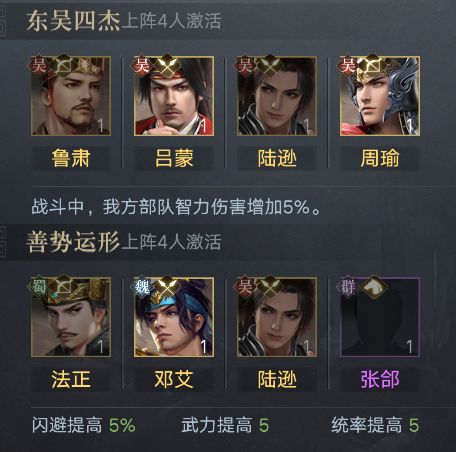 在于鲁肃、吕蒙、周瑜一同上场激活,效果为:战斗中,我方部队智力伤害增加5%
