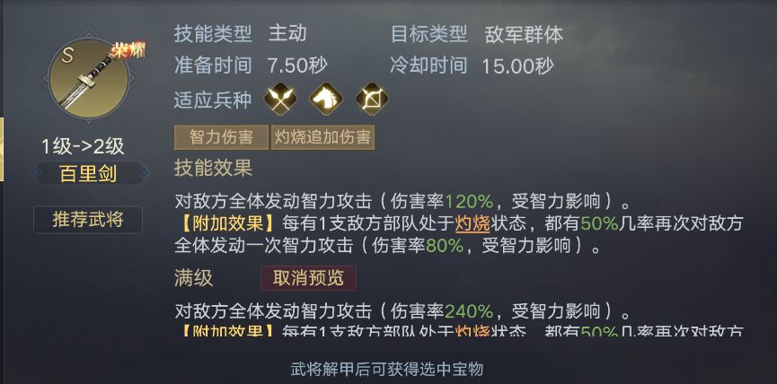 【附加效果】每有1支敌方部队处于灼烧状态,都有50%几率再次对敌方全体发动一次智力攻击(伤害率160%,受智力影响)