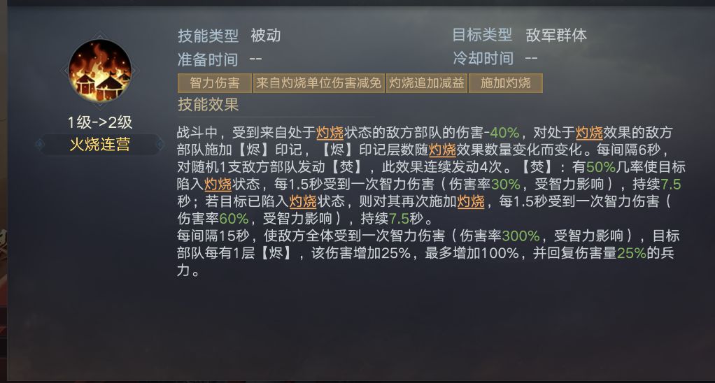 效果②:每有1支敌方部队处于灼烧状态,都有50%几率再次对敌方全体发动一次智力攻击(伤害率160%,受智力影响)