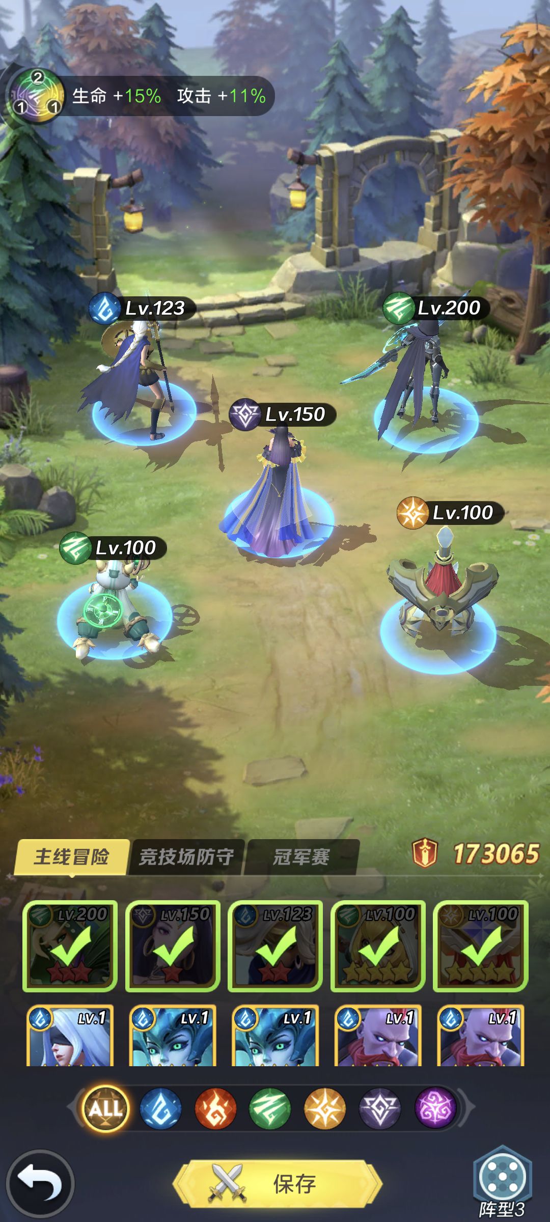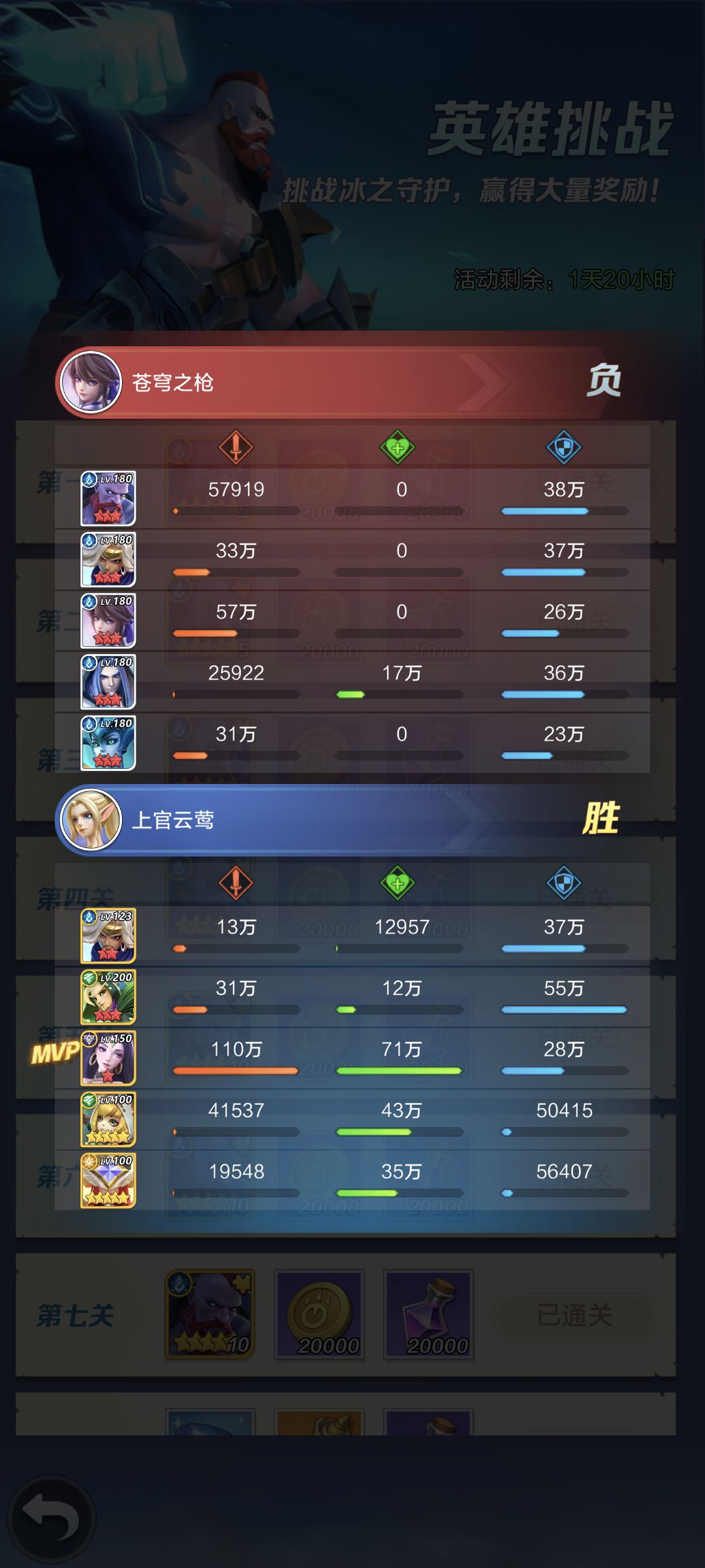 英雄配置:150级名伶带愤怒(主力输出),200级的魅影,七星冰盾,五星时光与微笑。名伶大家都有了,愤怒是实打实的输出提升 非常重要。魅影已经被我当成坦克来用了,可以看到她抗的伤害最多的,输出已经看不上了。另一个盾位选择轮回或者冰盾 给控制。时光和微笑这一关比较关键,两个大招都有净化。