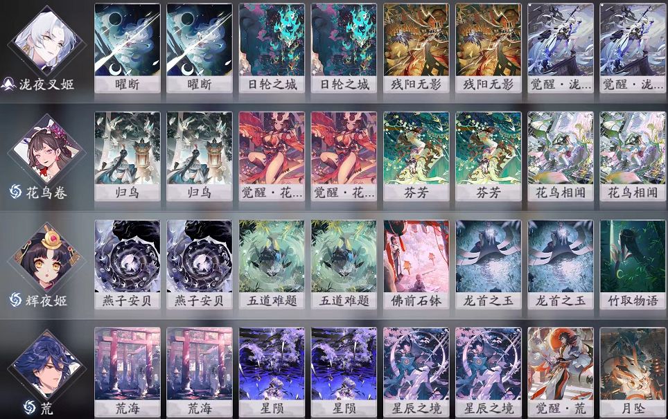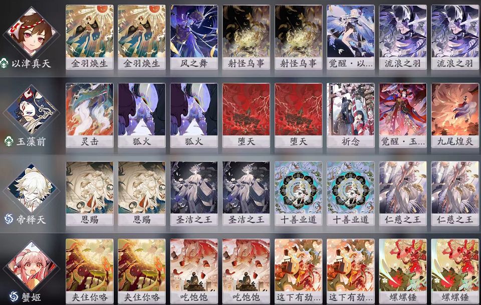 3张SSR,白狼、鸩是标准带法,吸血姬习惯1张形态(R)2血香(SR),云外镜因为版本问题,会带两张斗转,但是斗转连引斗转会很郁闷。