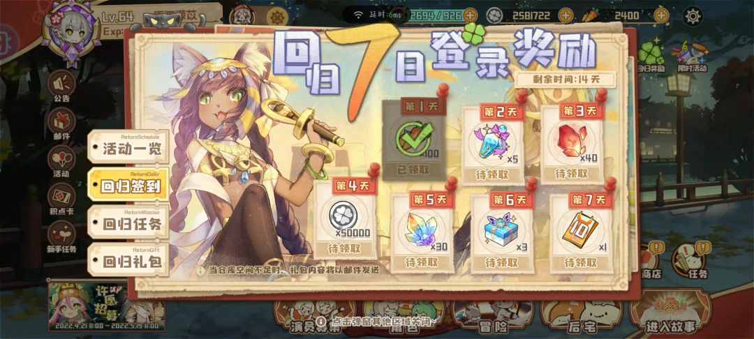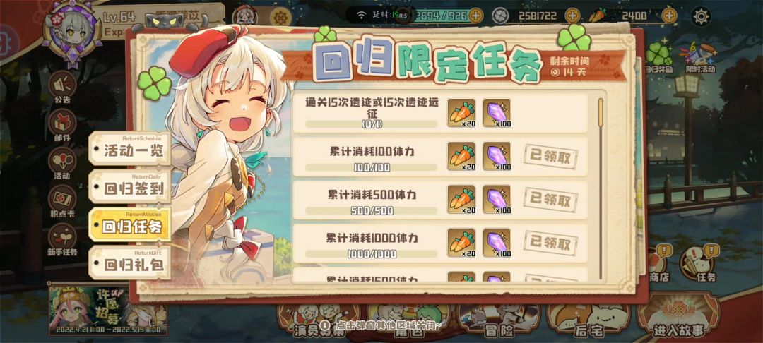 因为太忙了大概有两周没玩,刚刚想回来看看,然后一打开就是我打的最后那一局没打完的小邪神,打完之后点开回归任务栏,就看到全都显示已经做过了