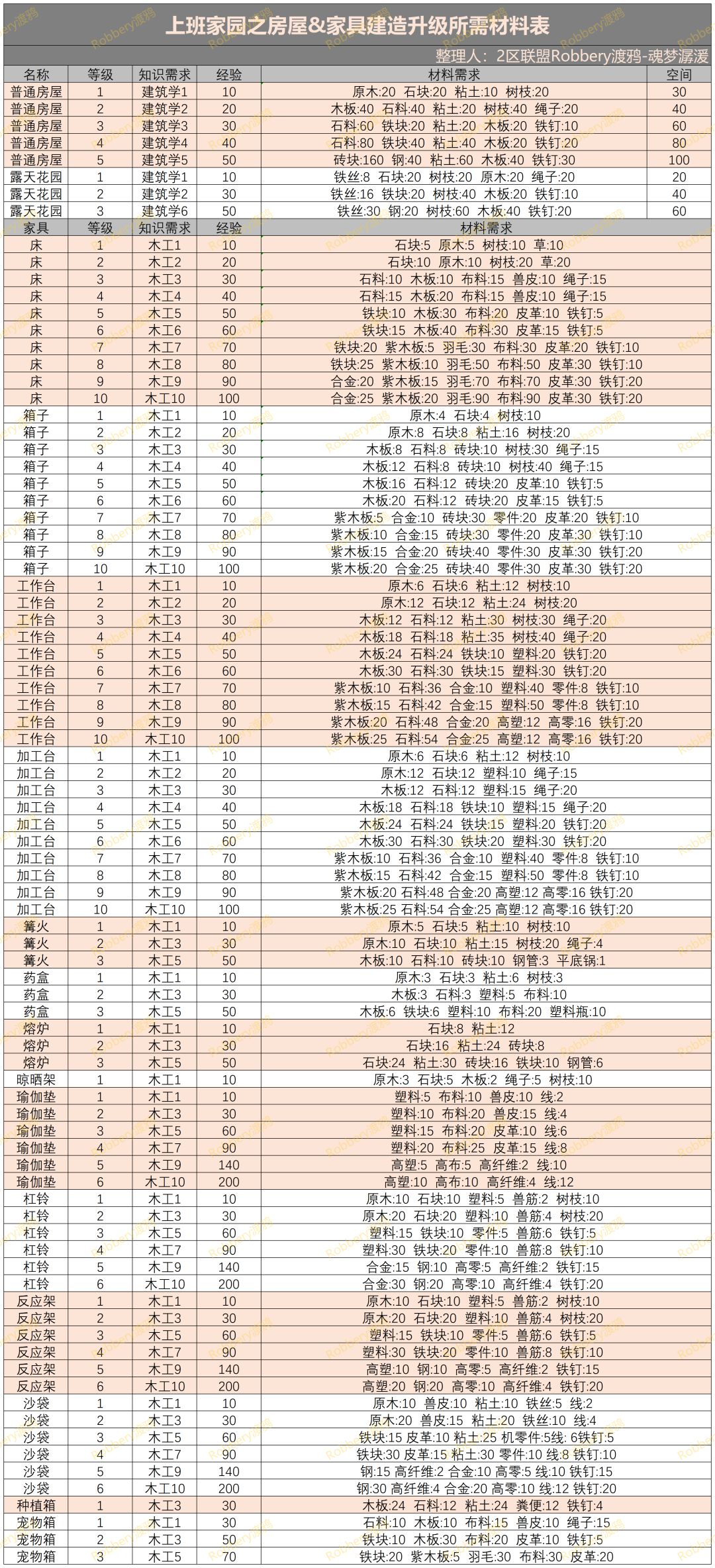 苦哈哈囤了不少材料,信心满满升级自己家去了,结果差了三百砖头☹️☹️。于是乎上论坛扒了扒帖子发现了大佬整理的消耗材料数量,内容很全,所需知识等级,木工经验,空间大小都有。