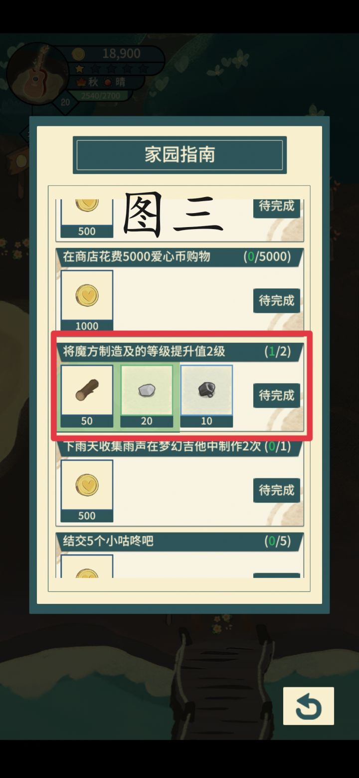 13.家园指南的某任务(图3),错别字以及我的魔方制造机都四级了啊(图4)。家园指南的问题除了已提到的两个(第12与13点)以外,还存在其他任务进度不动的情况,比如出售背包物品、小卖部购买物品、收获森林之心、邀请咕咚入住等。【bug!big bug!】(本来以为是自己没更新的原因,赶紧更新,但是更新并没有区别,再者,就算没更新我的游戏也紧跟着游戏更新的步伐的,比如咩咩不消失。)