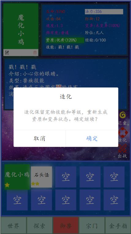 造化——造化保留宠物技能和等级,重新生成资质和变异状态。
