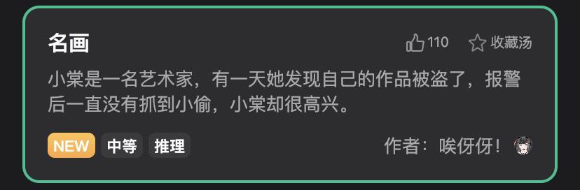 今天的海龟汤汤名叫做《名画》是一个推理 中等难度的海龟汤让我们先来看看今天的汤面吧~