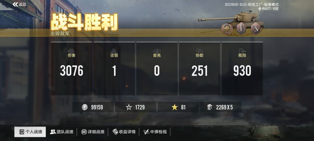m6a2e1(金面包)简单的评测。 大概先说两句如果你缺一个刷钱的车,这个勉强能用,如果你会m4的打法,这个车同级房还是很硬的的,但是防火炮能力基本为零,人机局收益可管,真人局比狮子略差 。 先说优点,炮还可以,实测数据没有纸面那么稀烂,分布挺小的,最小圈飞炮很少,收益很高,按照普通玩家3000伤害,基本一局十万左右的收益,正面装甲会打m4就很硬,不会摆m4角度,完全平地正对敌人也有一点抵抗力,弱点相对狮子小,但是弱点这个因人而异,会玩的眼里,一个7-头孢都是弱点,不会玩的人眼里,95就是叹息之墙。穿深虽然低,但是近距离因为车体高,打苏系之类跳弹车型居高临下按着打,可以一定程度无视苏系护甲,装填9s左右比狮子快点,满装填估计8s左右 再说说缺点,移动速度28,略慢,侧面和顶上装甲基本没有,并且车体又大又高,虽然窄,但是火炮抵抗力基本为零,侧面装甲基本忽略,卖不了侧卖不了履带,被人高打低的话正面首上随便穿,因为速度不快,所以抢点有弱势,抢坡俯角,对方比你快就是按着你打,那你等于没有护甲,眉观察是硬伤,脖子是致命伤。穿深略低,炮未缩圈的时候圈又大,命中感人,但是缩圈时间较长,移速转速双感人,基本被双人突破就是无抵抗能力。